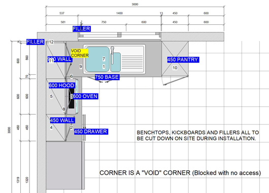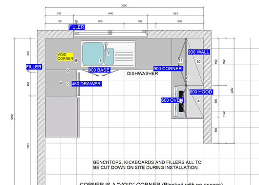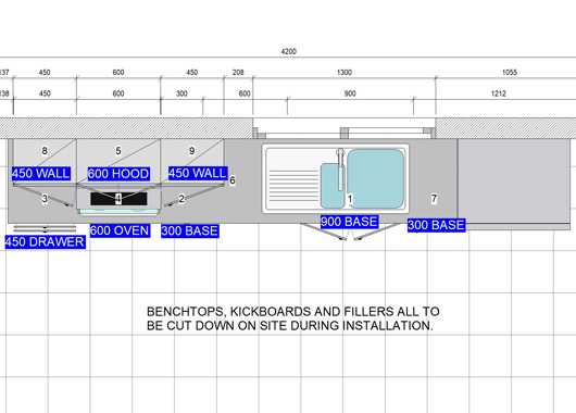 Melamine doors, Tight-form laminate benchtop.