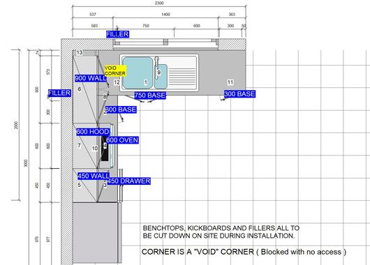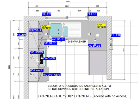 Melamine doors, Gloss laminate benchtops.