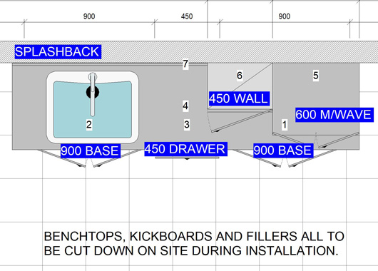 Melamine doors, Tight-form laminate benchtop.